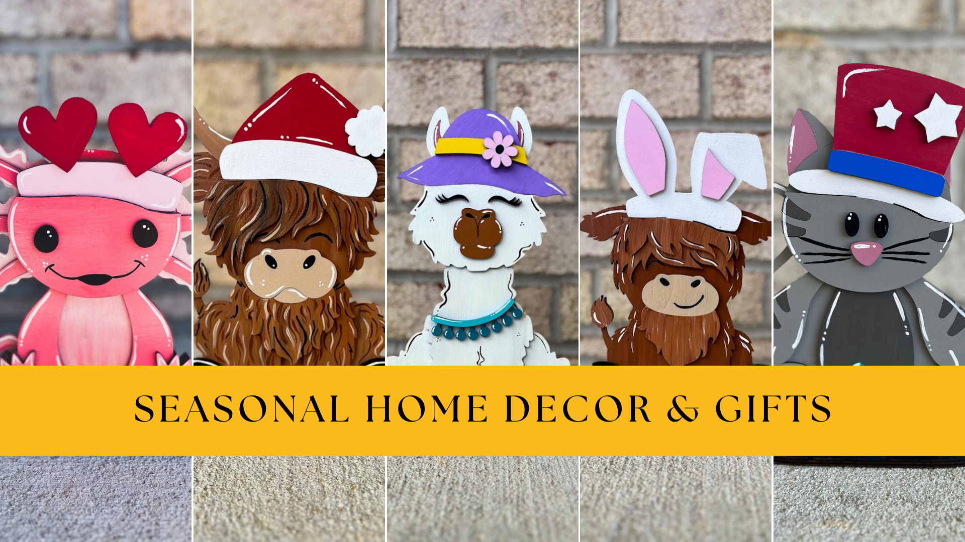 Holiday Highland Cow Shelf Table Desk Sitter with Interchangeable Seasonal Hats